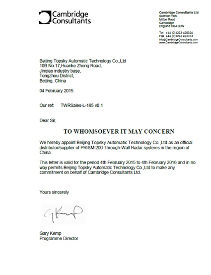 2015年2月4日,北京凌天正式成為英國劍橋cambridgeconsultants公司PRISM200穿墻雷達在中國的總代理