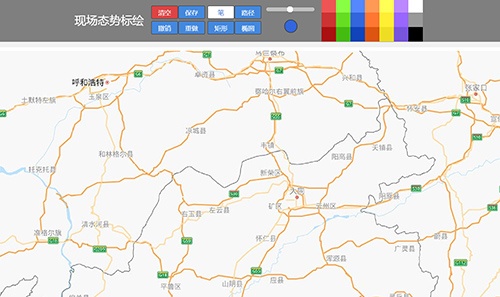 現(xiàn)場態(tài)勢標(biāo)繪,可進(jìn)入到地圖中,進(jìn)行線路的制作、路徑、矩形、圓形等操作選擇,及可對操作步驟進(jìn)行撤銷及畫筆的顏色選擇
