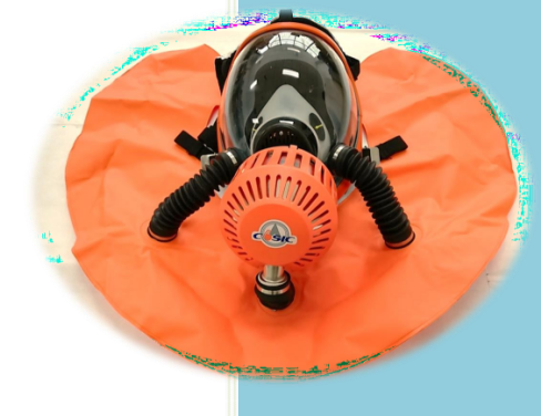 遇到緊急情況或者需要隔絕式防護的應急場合,使用人員應按佩戴的要求迅速戴上呼吸面罩,并根據(jù)個人臉型調(diào)整呼吸面罩上的緊固帶松緊程度,并佩戴緊固。人員呼出的低氧氣含量(17%左右)、高二氧化碳含量(4.5%左右)的氣體通過呼吸面罩的單向出氣口進入空氣再生罐。在空氣再生罐內(nèi),呼出氣體中的二氧化碳與生氧劑發(fā)生化學反應產(chǎn)生氧氣。當呼出氣體從空氣再生罐經(jīng)呼吸軟管流入氣囊時已置換成新鮮空氣。新鮮空氣儲存在氣囊中,人體吸氣時產(chǎn)生負壓,新鮮空氣分別沿氣囊左右兩側(cè)的呼吸軟管流回面罩內(nèi),完成一次空氣循環(huán)再生;并依次往復循環(huán)下去,連續(xù)不斷地提供人體呼吸所需的新鮮空氣。